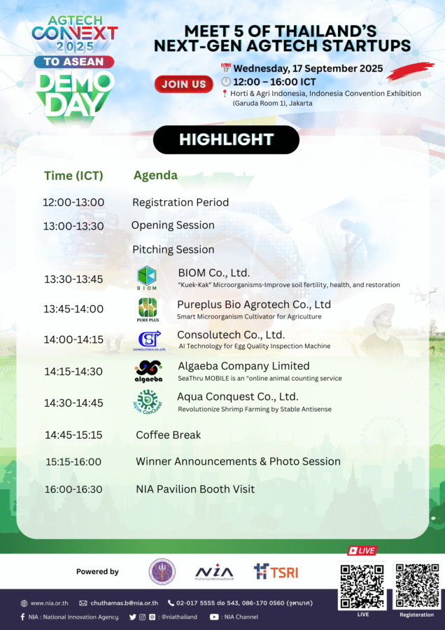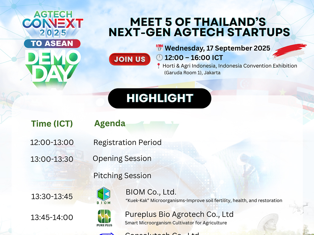 สำนักงานนวัตกรรมแห่งชาติ (องค์การมหาชน) หรือ NIA ภูมิใจนำเสนอการจัดงาน AgTech CONNEXT to ASEAN Demo Day ในวันที่ 17 กันยายน 2568 ซึ่งเป็นส่วนหนึ่งของงาน Horti & Agri Indonesia และ ILDEX Indonesia 2025 กิจกรรมในครั้งนี้มุ่งเน้นการนำเสนอ 5 สตาร์ทอัพด้าน AgTech ชั้นนำ ที่กำลังพลิกโฉมอนาคตของภาคเกษตรด้วยนวัตกรรมที่ชาญฉลาดและยั่งยืน เพื่อตลาดอาเซียนและระดับนานาชาติ ได้แก่: