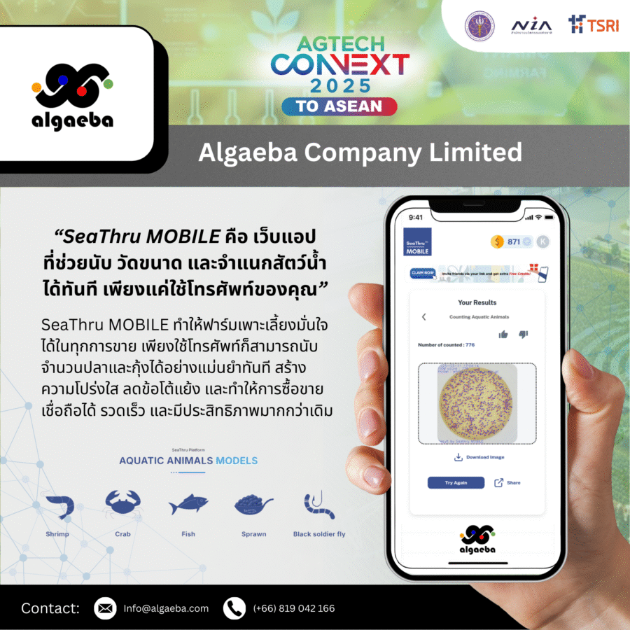- Algaeba Company Limited – SeaThru MOBILE AI บนเว็บสำหรับนับปลาและกุ้งที่เร็วและแม่นยำ
