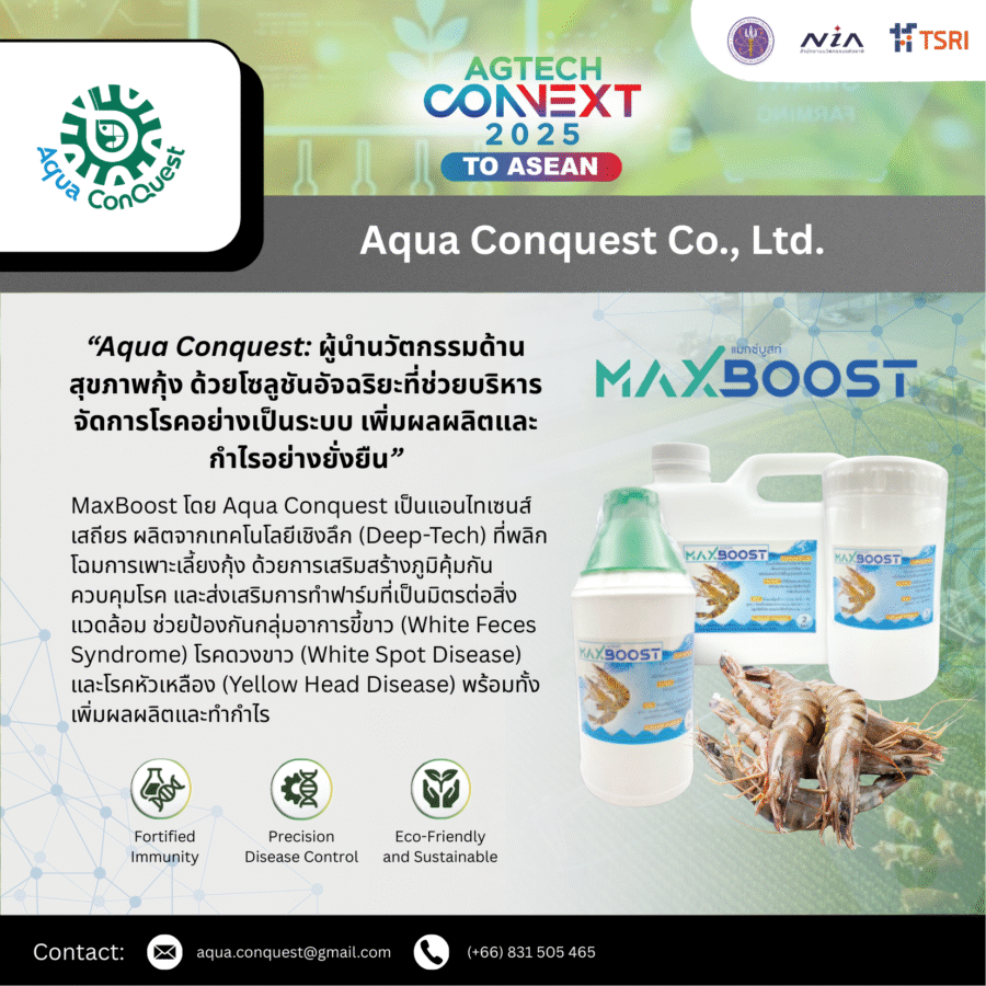 - Aqua Conquest Co., Ltd. – ยกระดับสุขภาพกุ้ง ลดการสูญเสีย เพิ่มผลผลิตด้วยนวัตกรรมการเพาะเลี้ยง