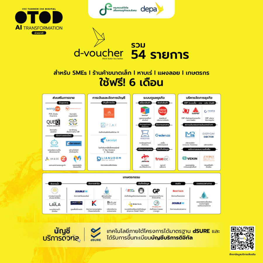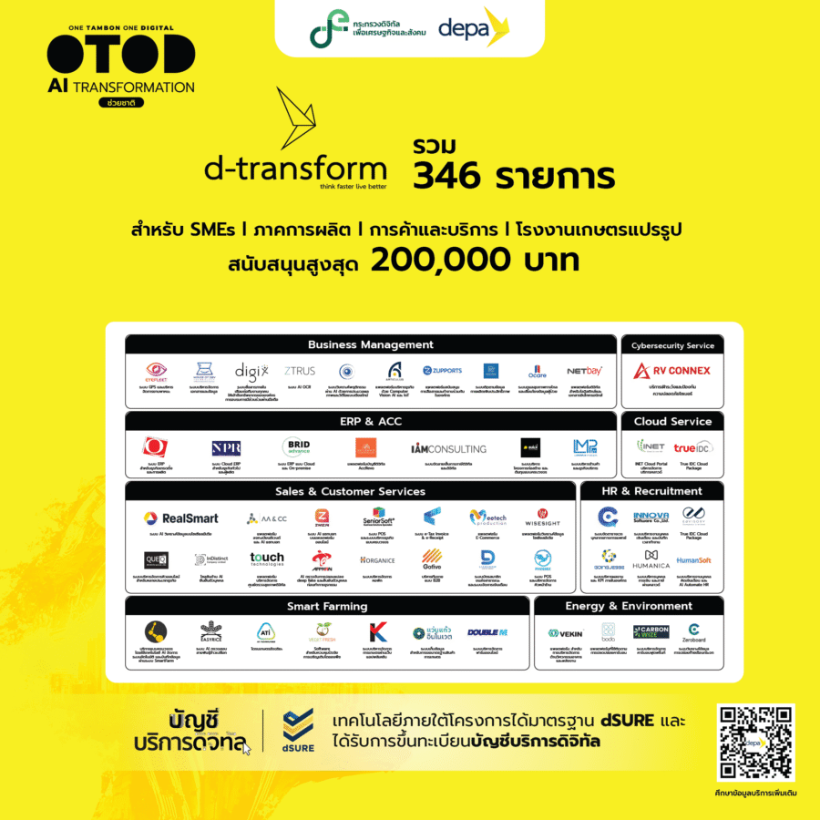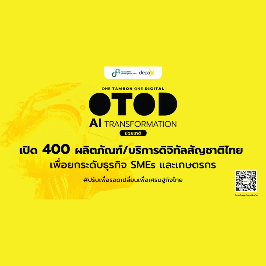 สำหรับผู้ที่กำลังมองหาผลิตภัณฑ์/บริการดิจิทัลมาประยุกต์ใช้เพื่อบริหารจัดการธุรกิจสามารถสมัครเข้าร่วมโครงการ OTOD AI Transformation ช่วยชาติ เพื่อขอรับการส่งเสริมและสนับสนุนได้ตั้งแต่วันที่ 1 ตุลาคมนี้ หรือศึกษารายละเอียดของผลิตภัณฑ์/บริการดิจิทัลทั้งหมดได้ที่ https://short.depa.or.th/Hx0Djสอบถามข้อมูลเพิ่มเติมที่ 061-298-7774, LINE OA: @OTODAI และอีเมล: OTOD.AI@depa.or.th.
