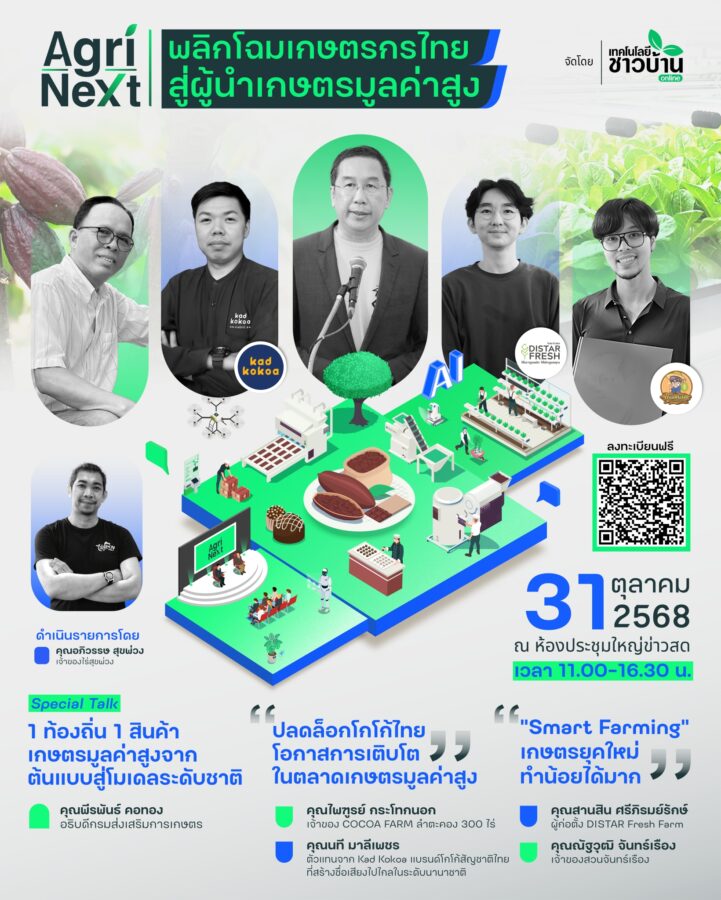📌ร่วมฟังงานสัมมนา ‘Agri-Next พลิกโฉมเกษตรกรไทย สู่ผู้นำเกษตรมูลค่าสูง’ ได้ โดยการลงทะเบียนล่วงหน้าได้ที่ https://forms.gle/hJ5zCS74FLaorNVv9 (จำนวนจำกัด)